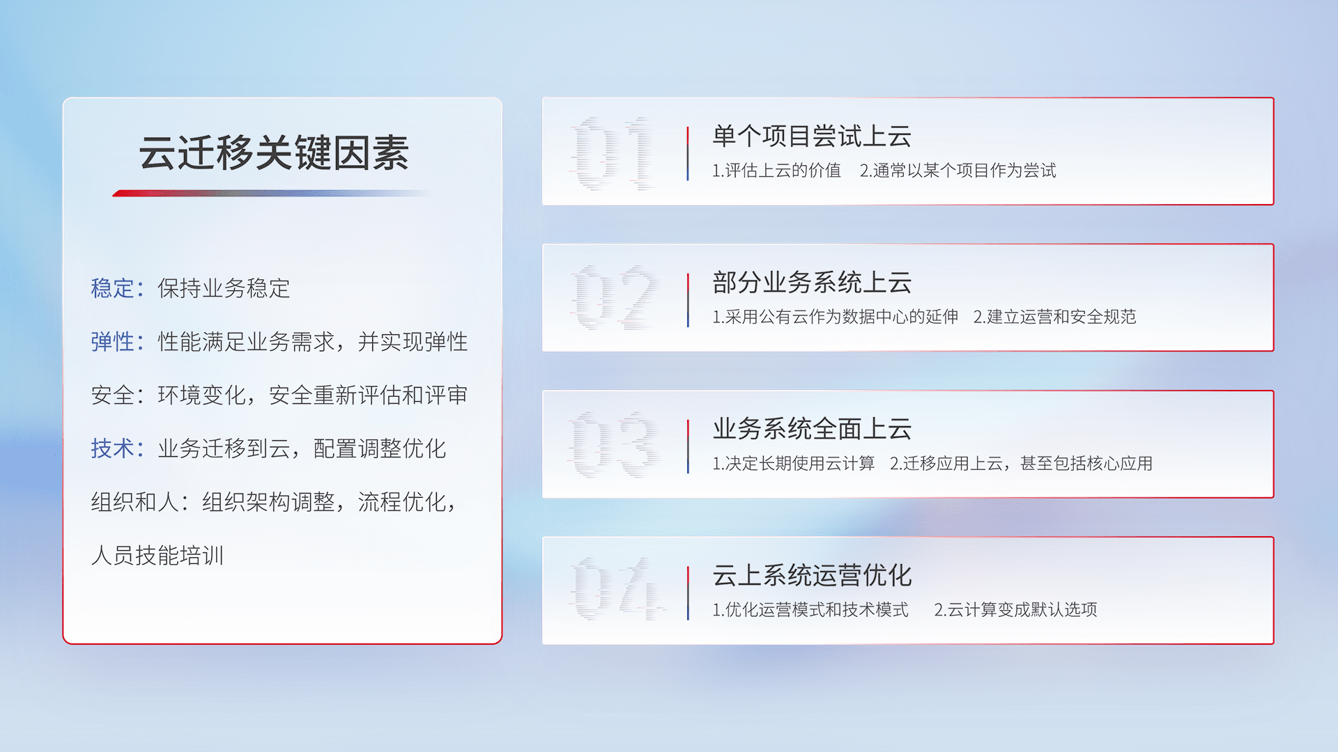 结合实际业务,,,,从规划设计、、、云平台选型、、、云原生改造、、、、数据迁移、、集成交付,,迁移全过程为客户识别最佳上云路径,,,做好风险识别管理,,,,设计网络架构、、身份权限、、、、安全审计合规、、、操作审计、、、日志审计、、监控告警策略、、多站点容灾设计等,,,,对云上基础设施进行整体规划,,,,提升IT治理水平,,以满足弹性、、、高可用、、、高性能的需求。。。